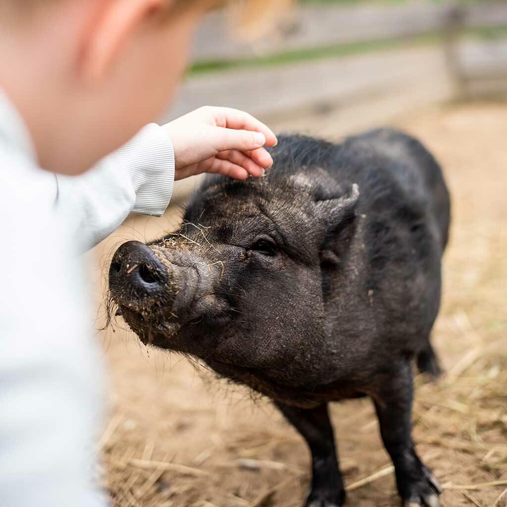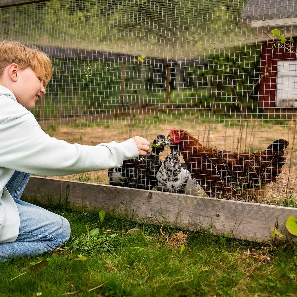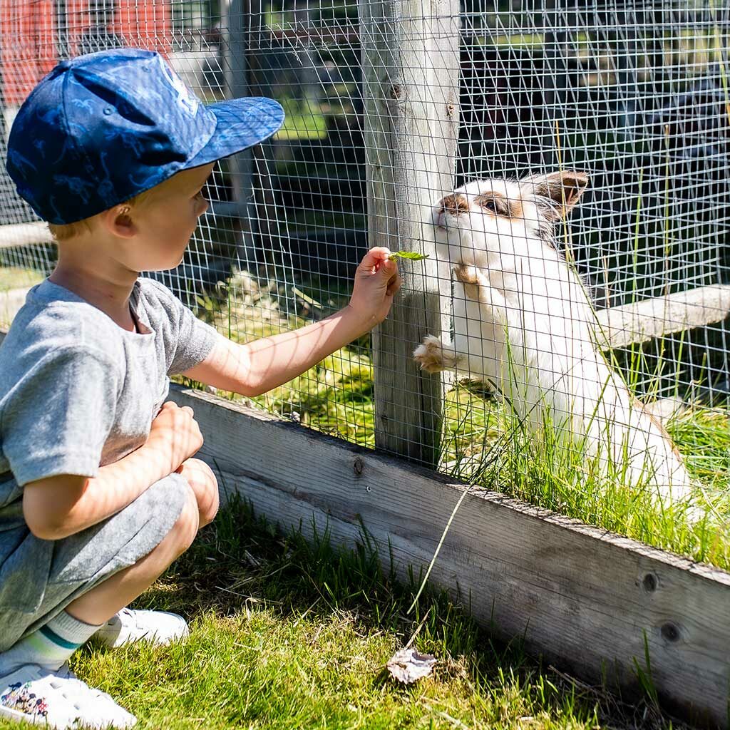 Her kan du si hei og god dag til høner, ender, sauer, geiter, bier, kuer og mange flere. Er du rolig og stille vil dyrene føle seg trygge med deg og kanskje får du oppleve en nær-snute-opplevelse.