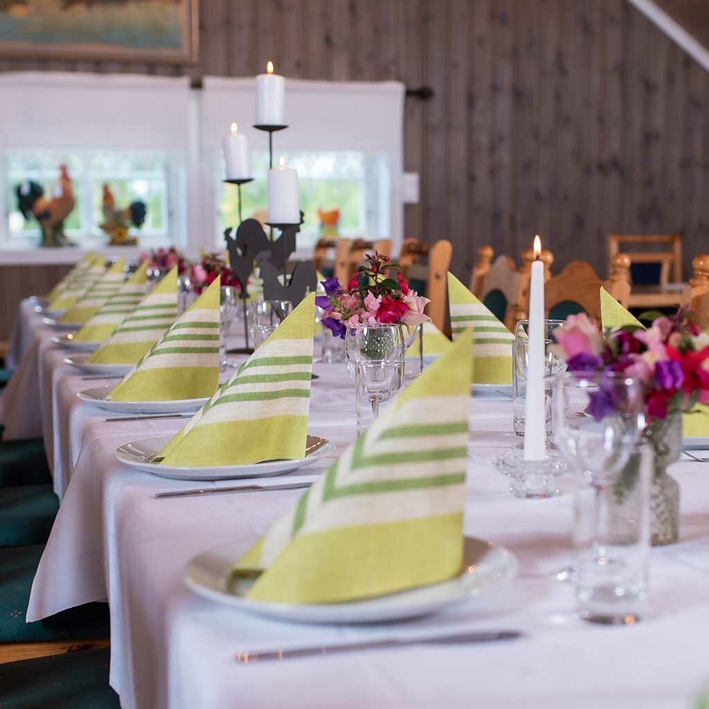 Vi har alt av dekketøy, lysestaker og blomstervaser som trengs til et hyggelig lag. Ønsker du at vi skal pynte og dekke for dere kan vi gjøre det, kostnad pr person. Arrangementer avsluttes klokken 02.